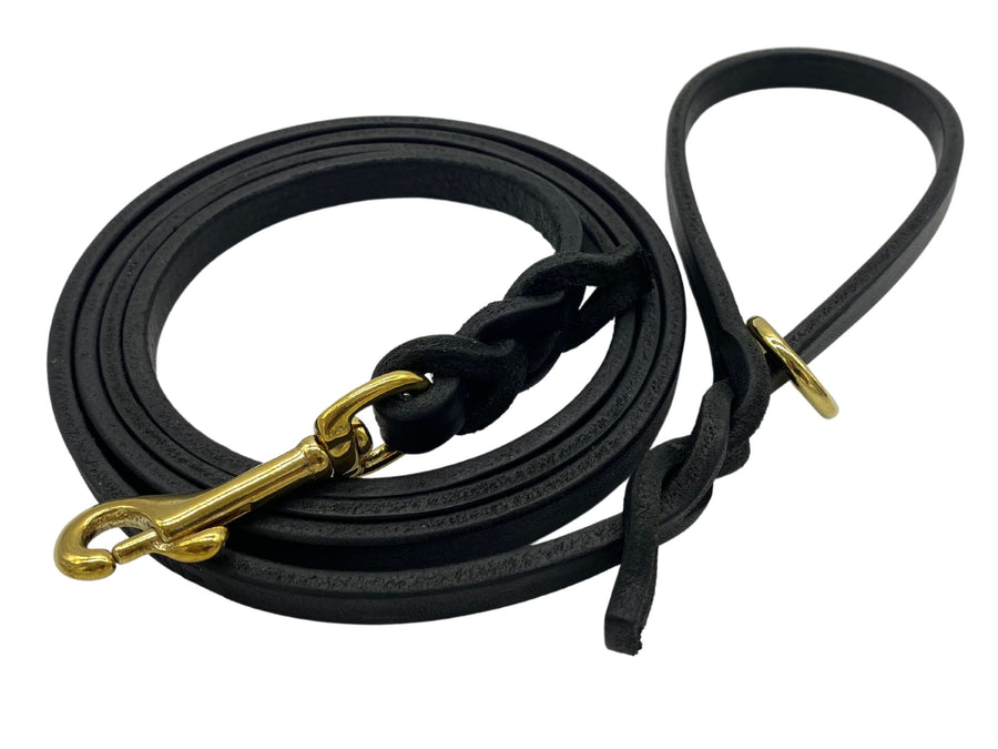 Simple in appearance, this leather dog leash is designed to be both beautiful and functional. Braided leather on both ends of the leash provide for a much stronger, long lasting dog lead. This one-piece latigo leather dog leash does not have any stitching to come undone and there no rivets to wear out. Made from the highest quality latigo leather this dog leash is stronger and more flexible than other leather dog leads. Each leather leash edge is hand beveled for a smooth feel throughout the length of the leash and made with the highest quality solid brass metal hardware.