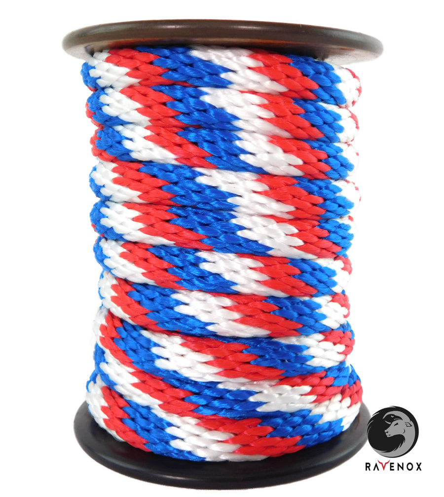 RAVENOX RED, WHITE & BLUE SOLID BRAID POLYPROPYLENE CORDAGE - AVAILABLE IN MULTIPLE DIAMETERS LENGTHS.