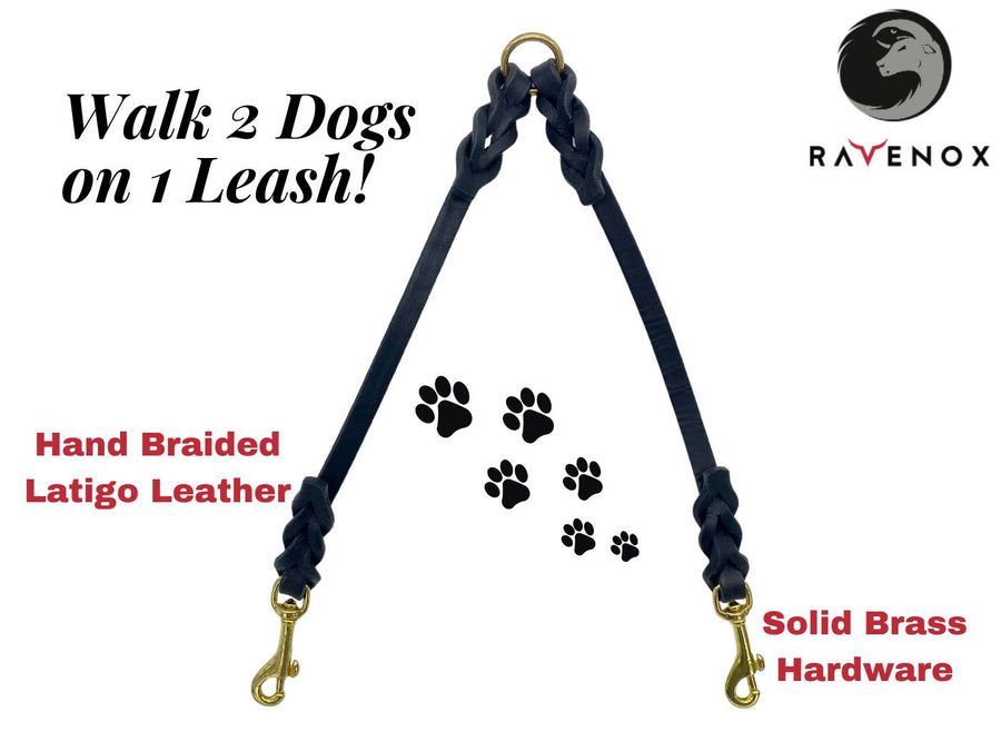 Clip your standard dog leash to the center solid brass O Ring and clip a dog to each end of the coupler’s solid brass snaps and you’re ready to walk two dogs on one leash! This dog leash coupler measures 15 inches in length and the hand braided latigo leather is 1/2-inch wide. Perfect for just about every size dog and great for dog walkers and exercising multiple dogs at once. Coupler leashes are very popular with veterinarians, dog obedience trainers & Police K-9 Units.