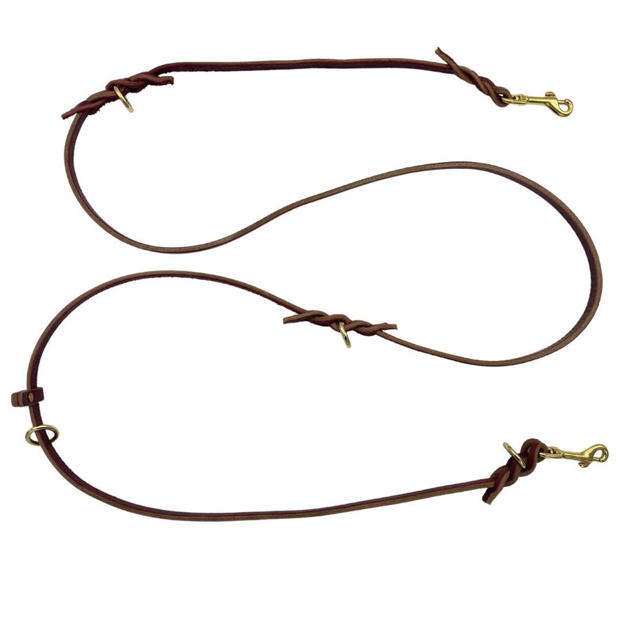 Three pieces of latigo leather are hand braided together with four solid brass rings and two solid brass swivel snaps to provide a wide variety of functional dog leash options. The leash measures 7 feet long and is 1/2-inch wide. This dog leash can be configured from either end so you can customize the dog leash for you and your dog. Use the leash as a 2-point harness for attaching to your dog’s collar and harness or for walking two dogs with one leash. It can be shortened from a 7 FT leash to a 5 FT dog Leash or a 4 FT dog leash. It’s also an easy-to-use slip lead with an adjustable leather security strap. Use one end to wrap around a post and this dog leash converts into a long tether. Place the leash over your shoulder in a cross-body loop and it becomes a hands-free dog leash.