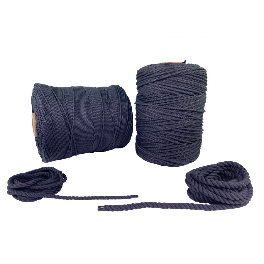 All of our black cotton macramé cord is made from strong upcycled cotton fibers - helping save the planet, one thread at a time. Our macramé cords are made in the USA on twisting machines that were also made right here in the USA - these machines have been making rope for over 125 years! These cotton twisted and braided cords and ropes are made at Ravenox's factory in North Carolina.