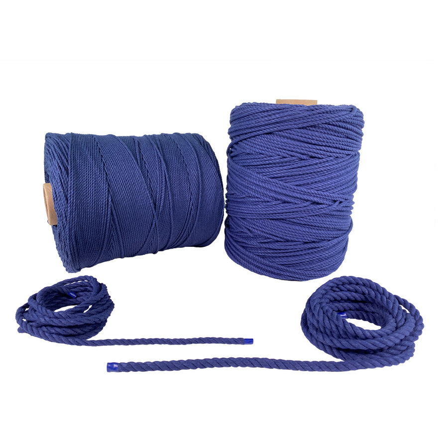 All of our navy blue cotton macramé cord is made from strong upcycled cotton fibers - helping save the planet, one thread at a time. Our macramé cords are made in the USA on twisting machines that were also made right here in the USA - these machines have been making rope for over 125 years! These cotton twisted and braided cords and ropes are made at Ravenox's factory in North Carolina.