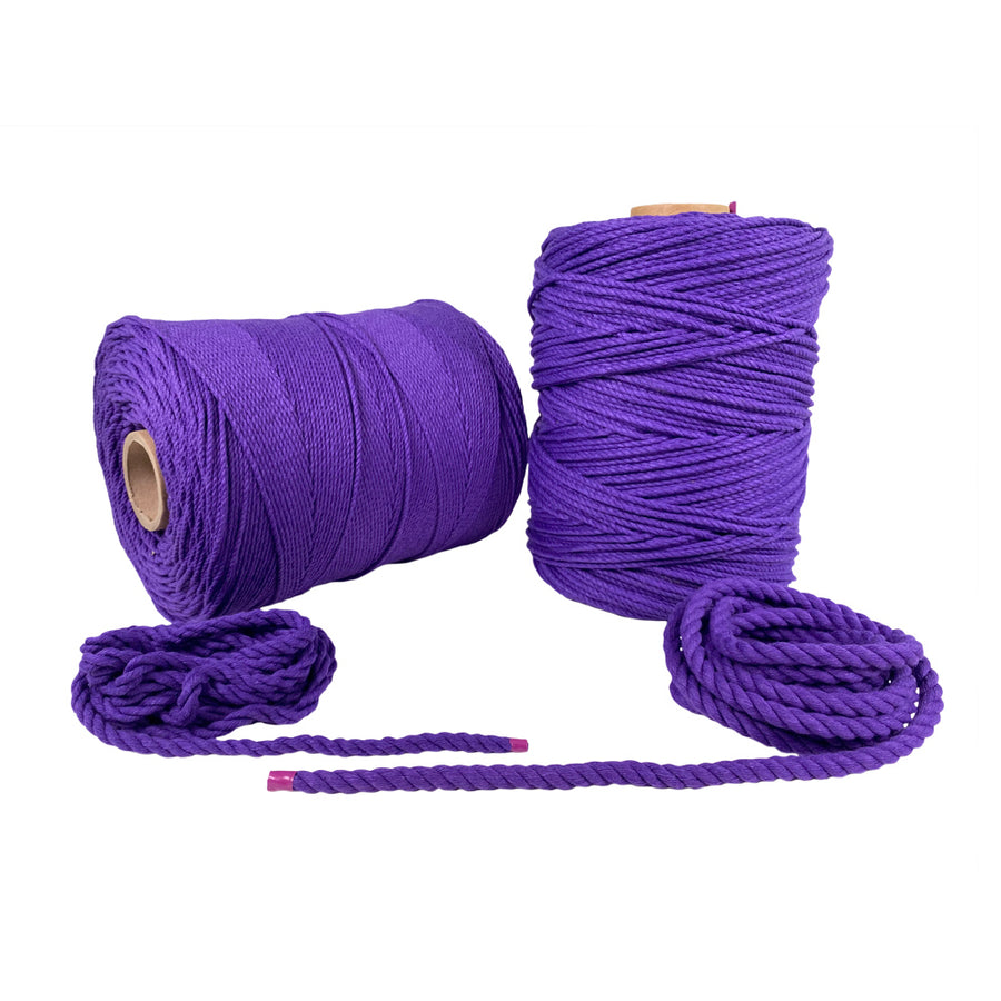 All of our purple cotton macramé cord is made from strong upcycled cotton fibers - helping save the planet, one thread at a time. Our macramé cords are made in the USA on twisting machines that were also made right here in the USA - these machines have been making rope for over 125 years! These cotton twisted and braided cords and ropes are made at Ravenox's factory in North Carolina.